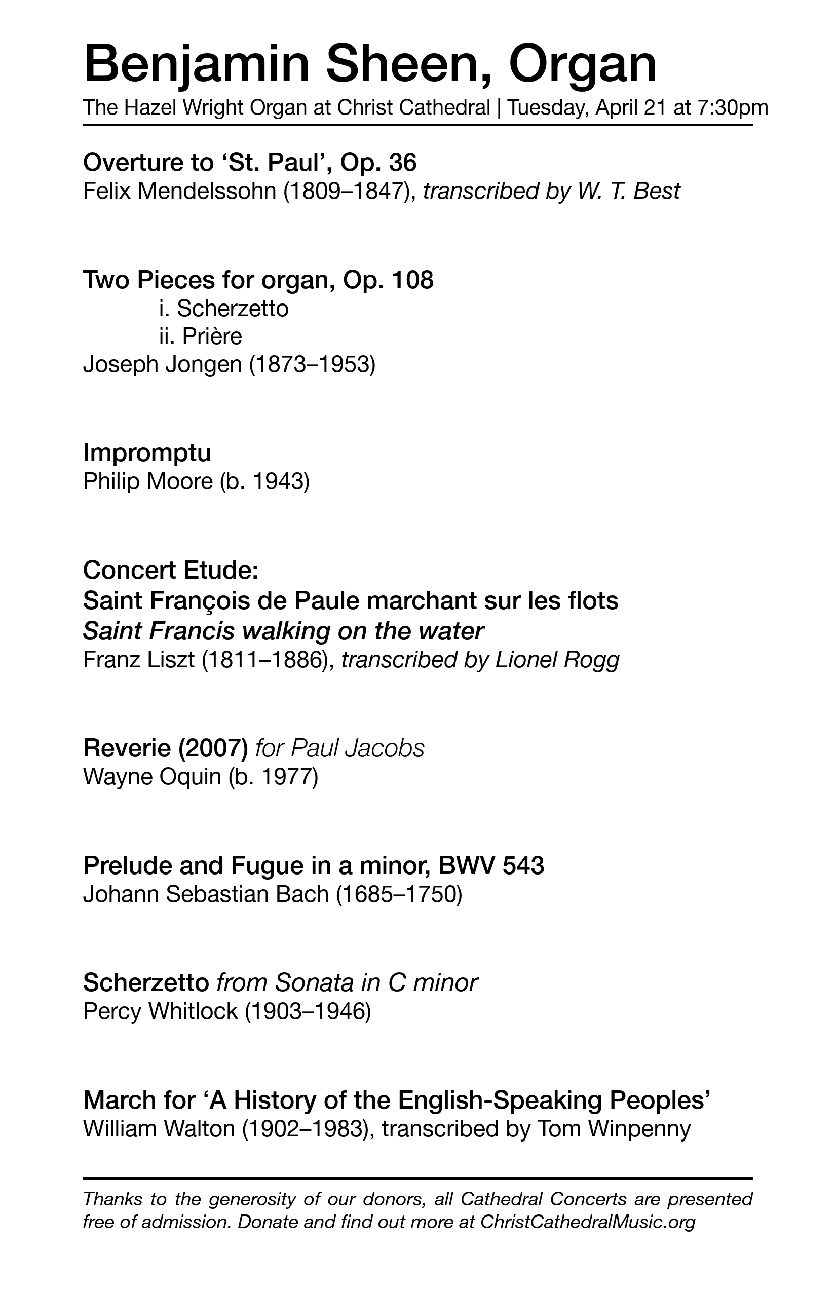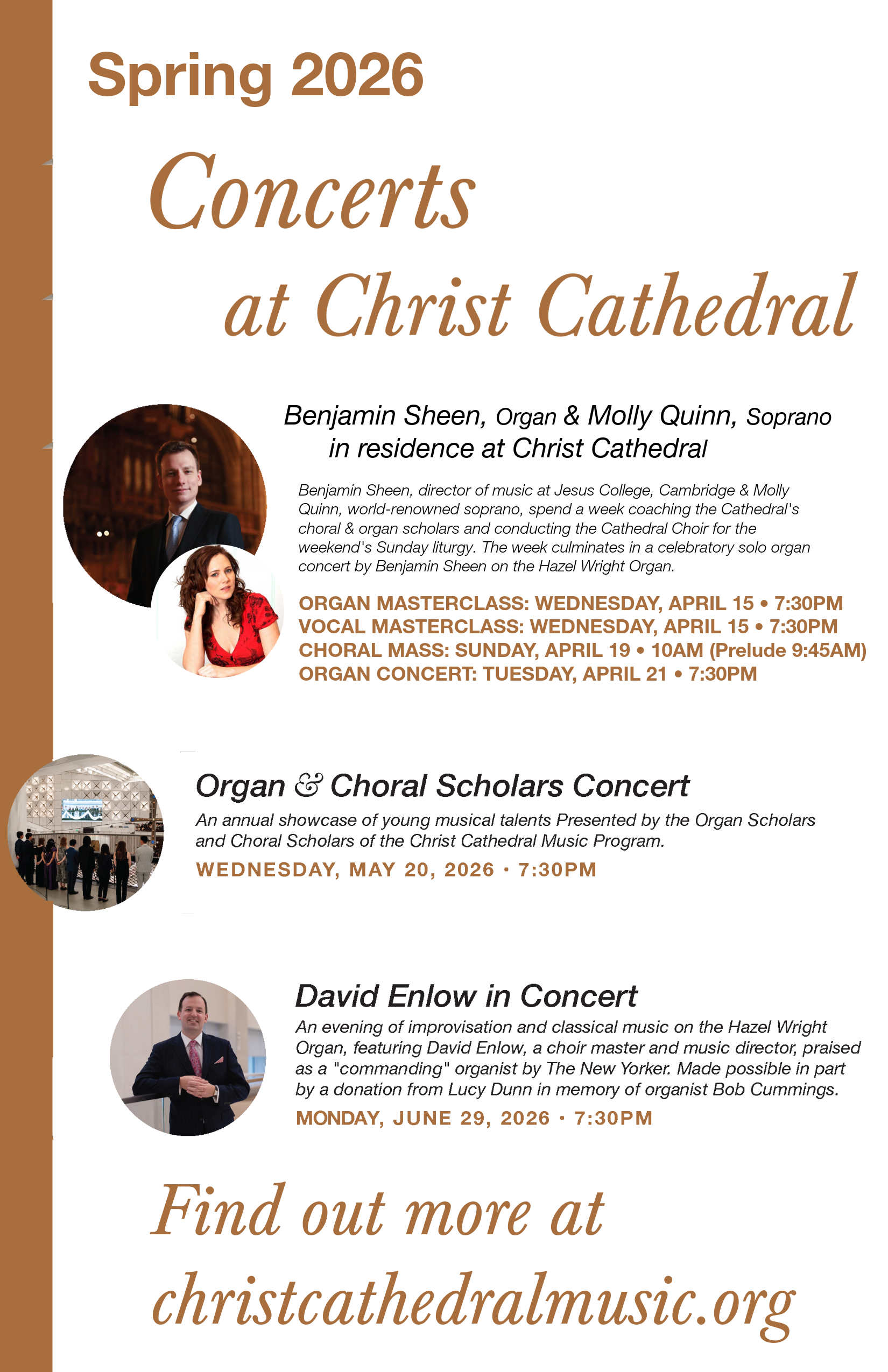 Music has always been an integral part of the Christ Cathedral Campus, and many notable musicians have held positions on the staff including Dr. John A. Romeri, the first Director of Music and Organist for the newly-dedicated Christ Cathedral; Dr. Frederick Swann, the famed organist for many years of the Hour of Power and the Crystal Cathedral; Mark Thallander, Richard Unfried, Tom Leonard, Christopher Pardini, Janet Thorsen, and Don Neuen.